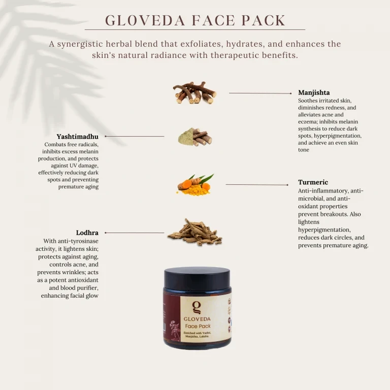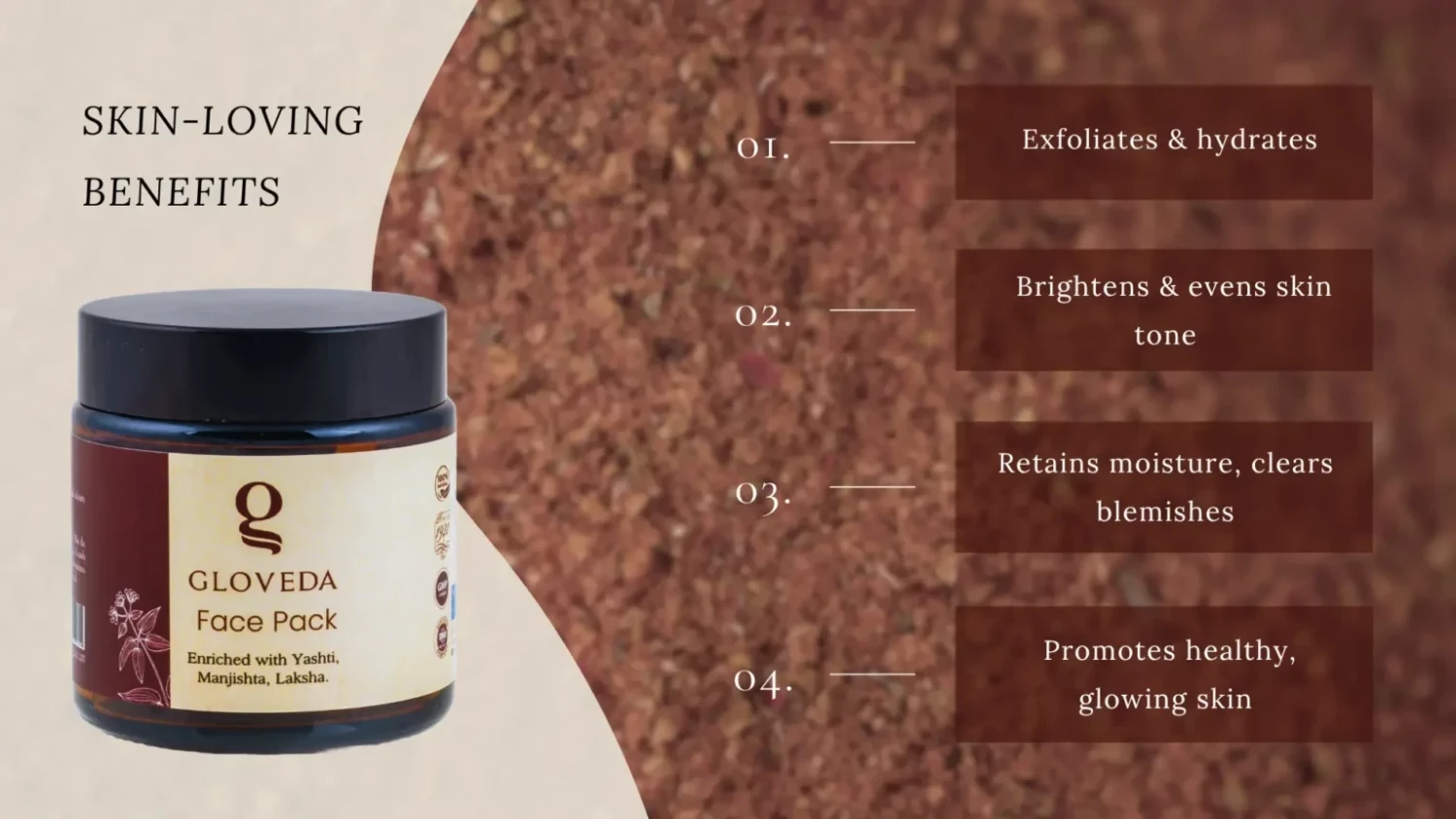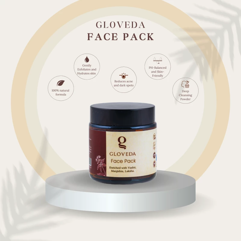 Gloveda Face Pack is a luxurious, 100% natural skincare treatment designed to exfoliate, hydrate, and brighten your complexion. Powered by time-tested botanicals like Manjishta, Yashtimadhu, Laksha, and Lodhra, this Ayurvedic blend helps reduce acne, pigmentation, and dullness while promoting a soft, radiant glow.